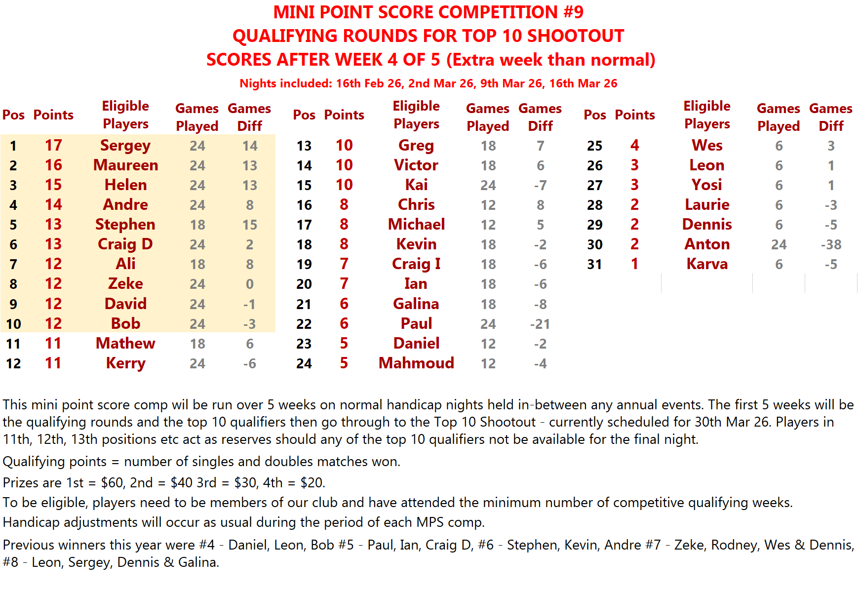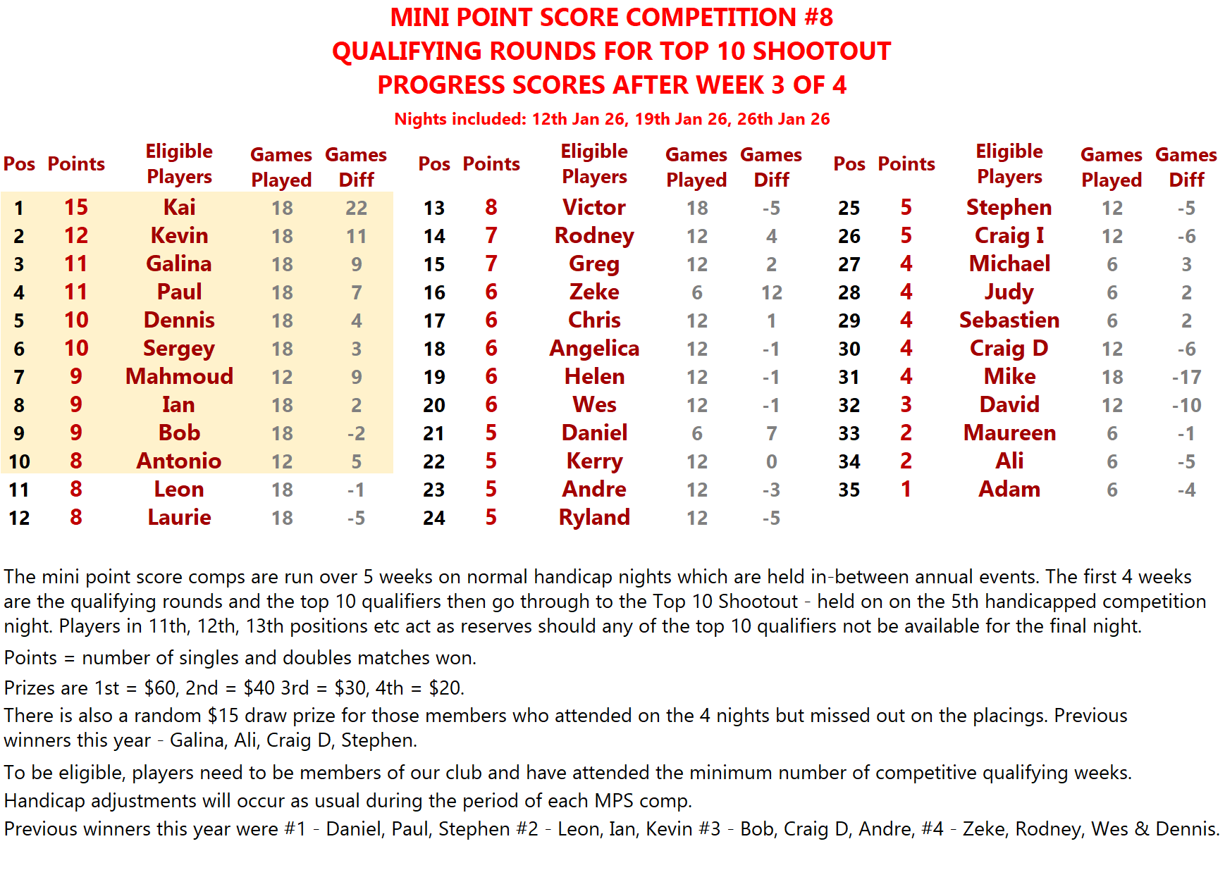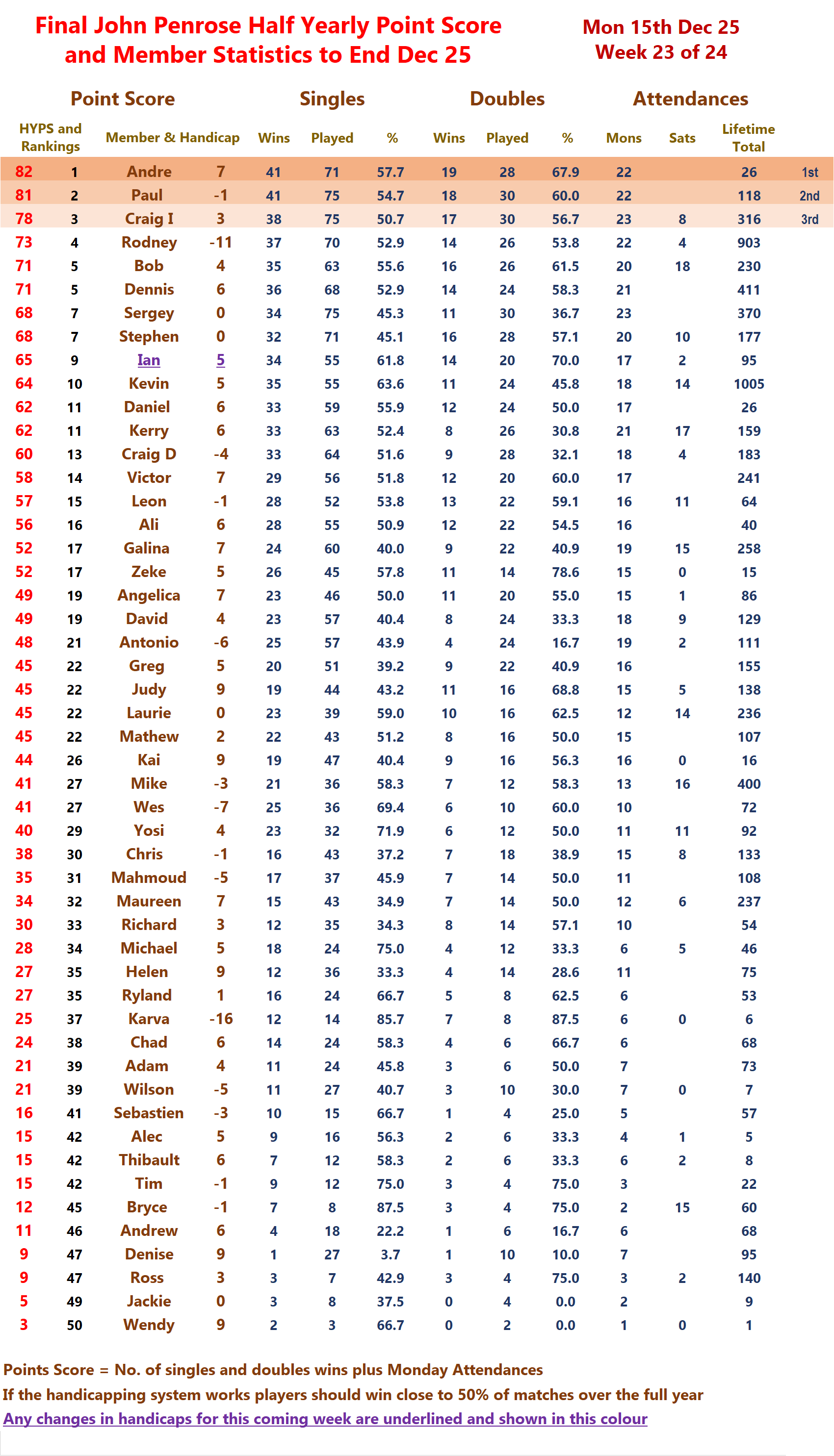 THE MINI POINT SCORE AND THE JOHN PENROSE HALF YEARLY POINT SCORE COMPETITIONS