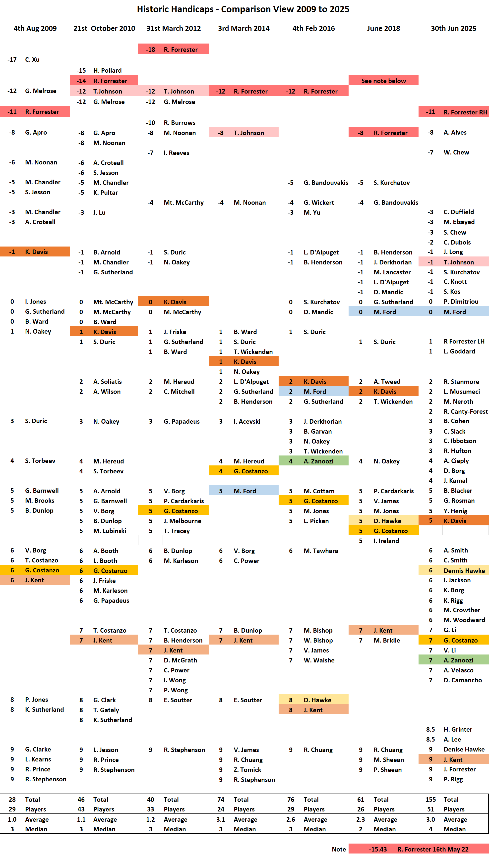 Below is a table consisting of some competition night handicap lists spanning from 2009 to 2025 showing a comparison between the handicaps/ratings. The first thing to mention is that handicaps are based on the relative playing standard, formats and circumstances prevailing at the time and are not absolute ratings so they cannot be used for accurate comparisons with other lists which were compiled at other times. However, the various lists are interesting for what they reveal and as can be seen, the average and median handicaps for the periods shown have been fairly consistent.
